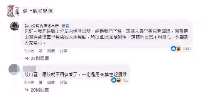 面對這種情況,網友們繼續調侃:究竟是會掏出BB槍的阿嬤更凶,還是會搶你早餐的獼猴更厲害呢?