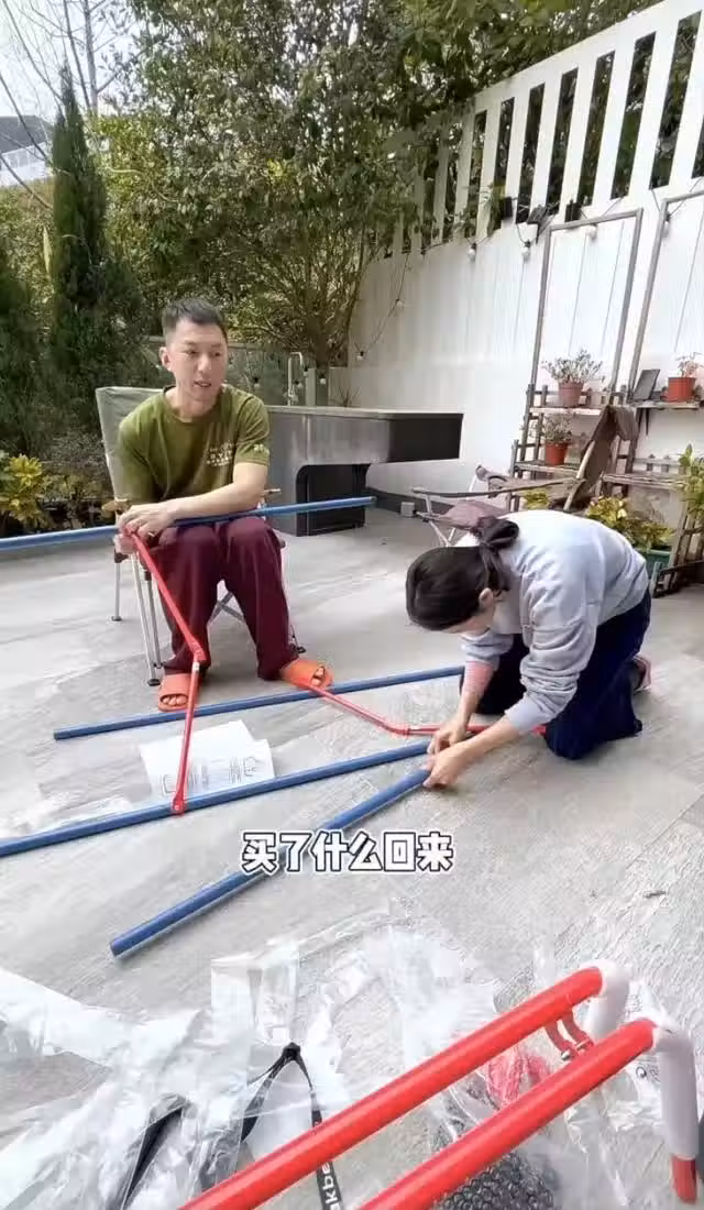 短片中的張寶兒和老公袁偉豪一起在組裝一個鞦韆,雖然這個鞦韆組裝的過程不是很繁瑣,但是也需要一定的時間。