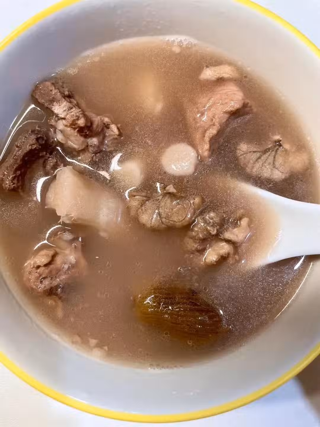 食材:太子參5克,核桃15克,蓮子8克,芡實10克,黑豆15克,新鮮山藥一條,豬骨400克,蜜棗1個