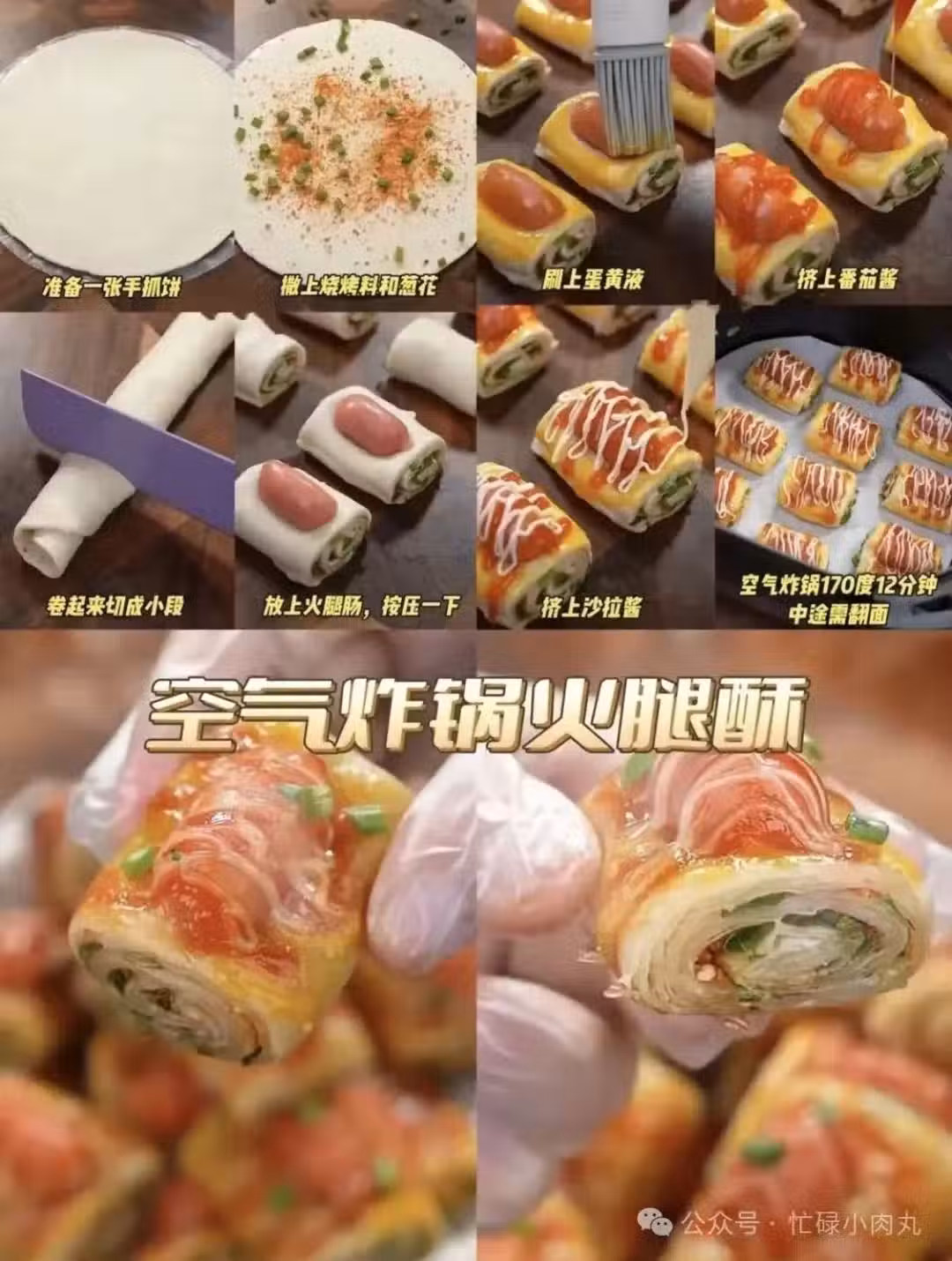 6⃣️誰能拒絕這一口空氣炸鍋紫薯甜甜圈! 蒸熟的紫薯加入牛奶、白糖搗成泥,鋪在手抓餅上,撒上芝士碎後捲起,搓成甜甜圈造型。刷上蛋黃液、改刀後撒上黑芝麻,180度烤15分鐘,中途翻面。外皮酥脆,內餡軟糯拉絲,一口就愛上這香甜滋味 。
