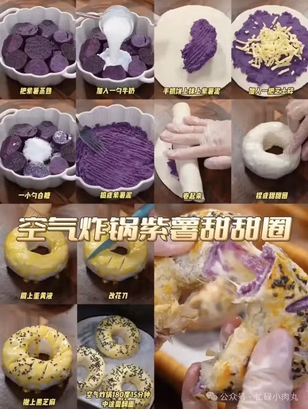 7⃣️早餐或下午茶,試試這道空氣炸鍋雙薯西多士! 紅薯、紫薯分別蒸熟,加糖、牛奶、芝士搗成泥,塗在手抓餅上。將紅薯層與紫薯層交替疊加,切掉邊邊,刷上蛋黃液,撒上黑芝麻,180度烤12分鐘,中途翻面。層次豐富,香甜軟糯,每一口都是滿足 。