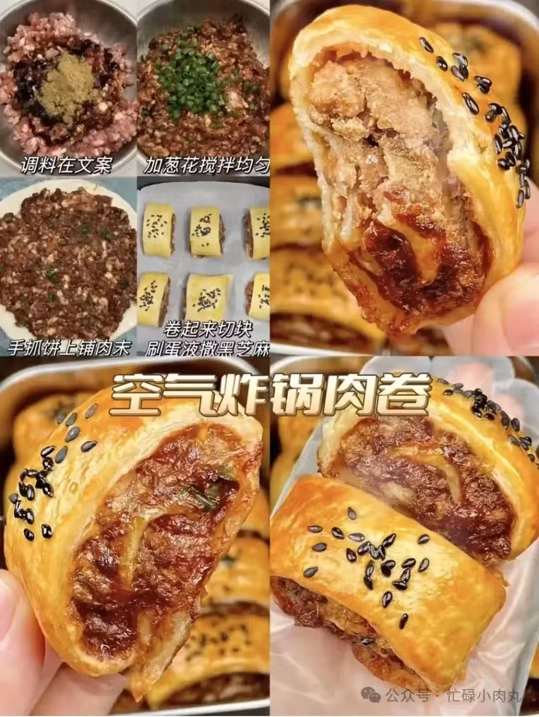9⃣️饞香酥小食?空氣炸鍋蔥香火腿鍋盔安排! 火腿腸切丁與小蔥末等調料拌勻做餡,手抓餅切成四塊包入餡料 。按成餅狀,撒上芝麻,放入空氣炸鍋180度先烤15分鐘,翻面再烤5分鐘左右。外皮酥脆,內餡蔥香與火腿香交織,一口下去超滿足,美味停不下來!