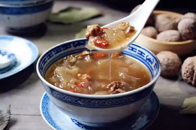 1. 銀耳提前浸泡幾個小時;去蒂,切成小塊 2. 將銀耳、核桃仁放進燉盅里 3. 加入枸杞子,倒入水 4. 放進電燉鍋里,燉1.5個小時 5. 在結束前10分鐘,加入冰糖即可