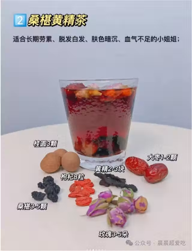 說明:脫髮白髮多是長期勞累身體虧空所致,尤其是腎氣不足所致,桑葚和黃精屬於典型的黑色食材,長於補氣養陰益腎,枸杞也具有滋補肝腎的作用,玫瑰桂圓紅棗可以改善氣色補氣色,本款作用相對復合。直接沖泡🥛或者養生壺模式都是可以的。