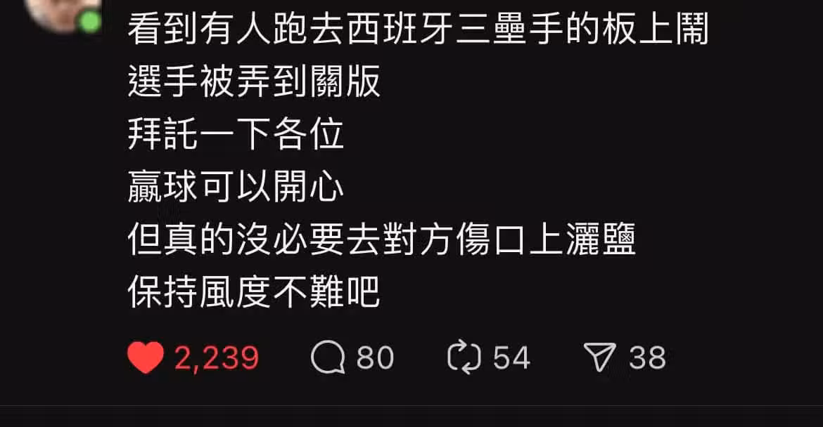 但有網友指出,目前恩卡納西昂的IG因為部分不理性的台灣球迷嘲諷,於稍早關閉公開帳號,讓他忍不住痛批,「看到有人跑到西班牙三壘手的版上鬧,選手被弄到關版。拜託一下各位,贏球可以開心,但真的沒必要去對方傷口灑鹽,保持風度不難吧」。