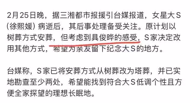 徐家將樹葬改為塔葬,主要是考慮具俊曄的感受,希望能找到符合大S低調個性的地方,最後徐家人依舊不會選擇公開大S的安葬之處,希望在親友的陪伴下陪她走完最後一程。