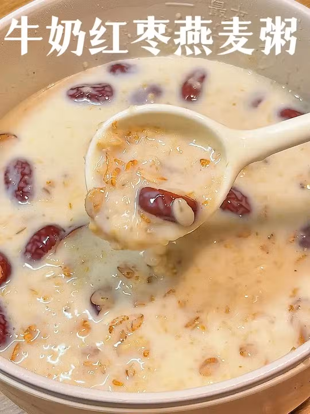 1️⃣紅棗洗凈,對半切開去核,放入鍋中,加入適量清水,煮3分鐘,倒入燕麥,煮2分鐘,倒入牛奶,攪拌均勻即可。
