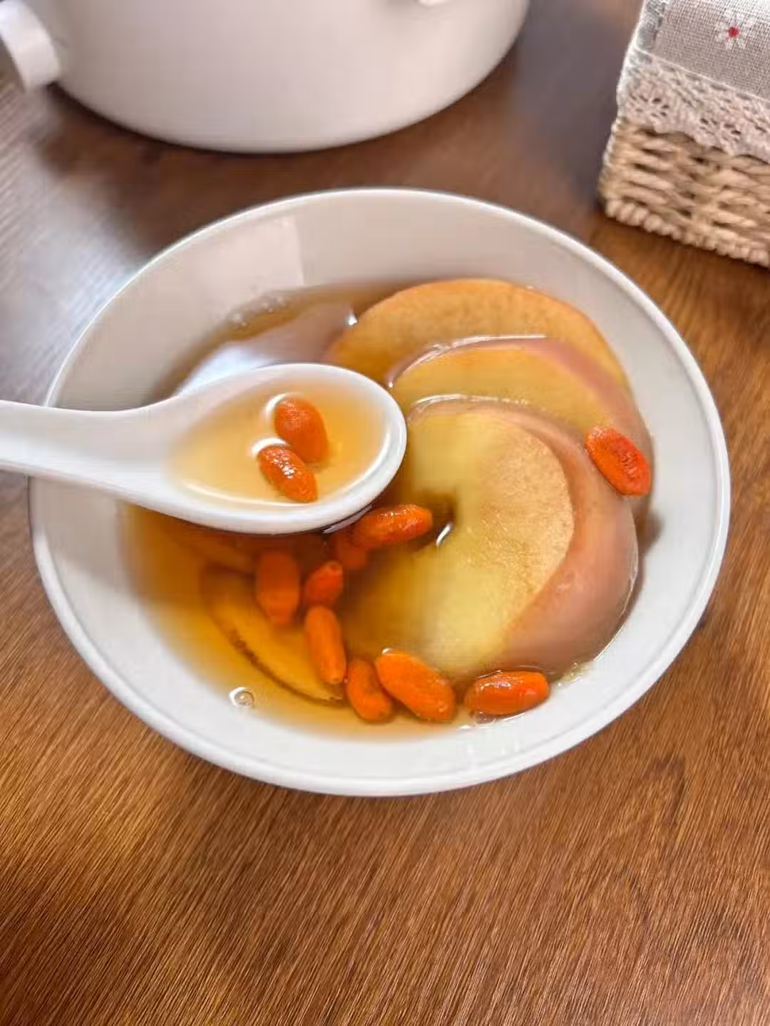 黃芪大補元氣,但不會像人參那樣猛烈,是溫和的補;枸杞補心血,煮熟的蘋果促消化,調和脾,補氣血!