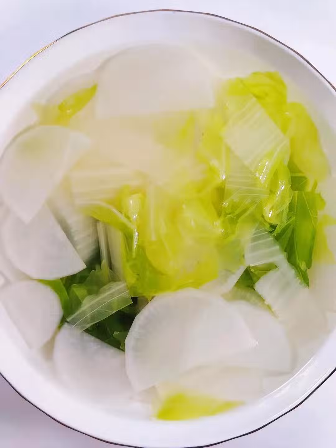 將白蘿蔔和白菜切絲放入鍋里,加適量清水,大火煮開後小火慢煮十分鐘左右就可以了。
