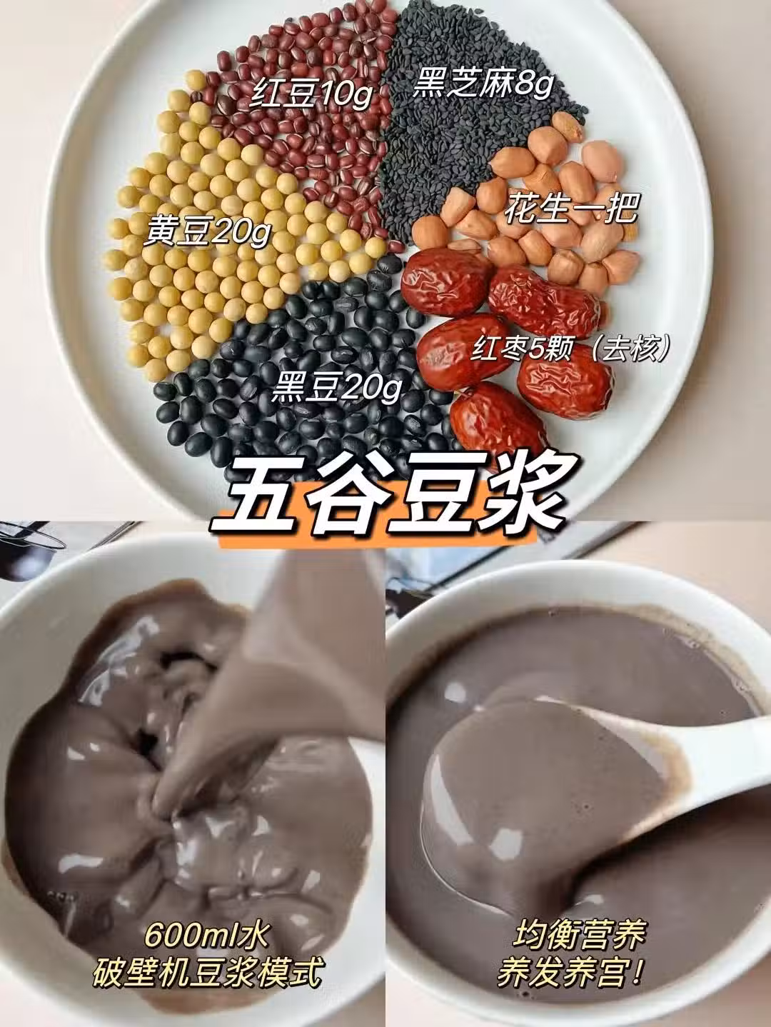 食材:黑豆20g、黃豆20g、紅豆10g、黑芝麻8g、花生10g、紅棗5顆 做法:豆類浸泡後,與其餘食材加600ml水打成豆漿,紅棗自帶甜味無需加糖。 三、黑芝麻香蕉燕麥奶(免濾版) 燕麥膳食纖維促進代謝,香蕉增加順滑口感,乳糖不耐可換植物奶。