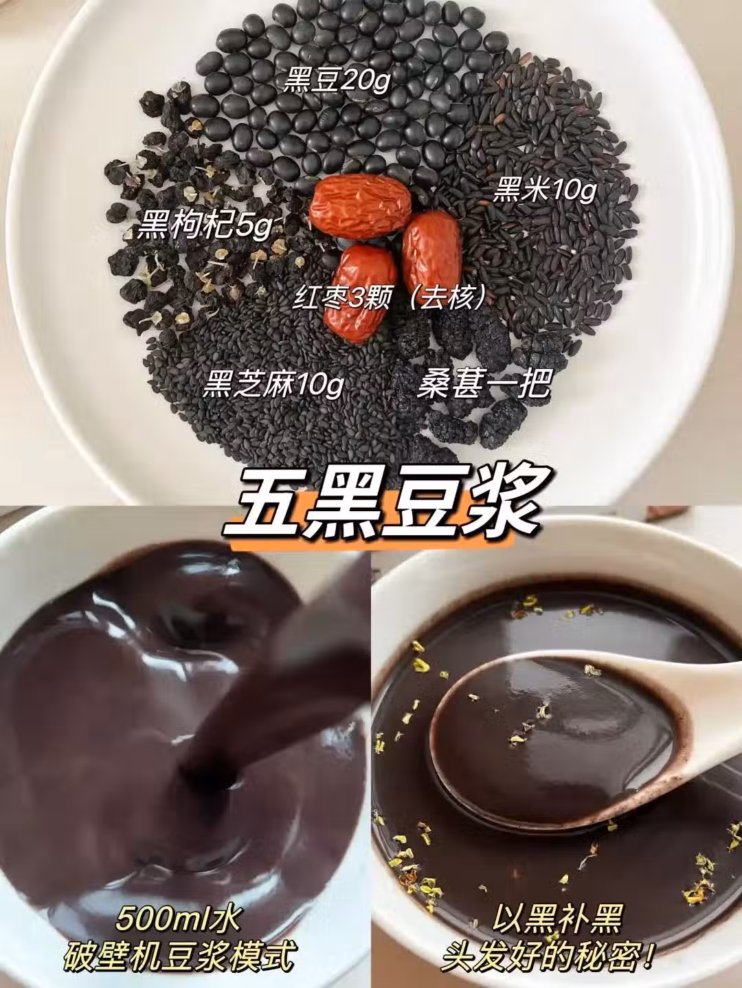 食材:黑豆20g、黑枸杞5g、黑米10g、桑葚干10g、紅棗3顆 做法:黑豆黑米浸泡後,與其餘食材加500ml水打成漿,枸杞桑葚最後2分鐘加入。 六、三黑薏米豆漿 薏米祛濕,搭配紅棗調和,適合南方潮濕地區易頭油、頭皮長痘的人群。