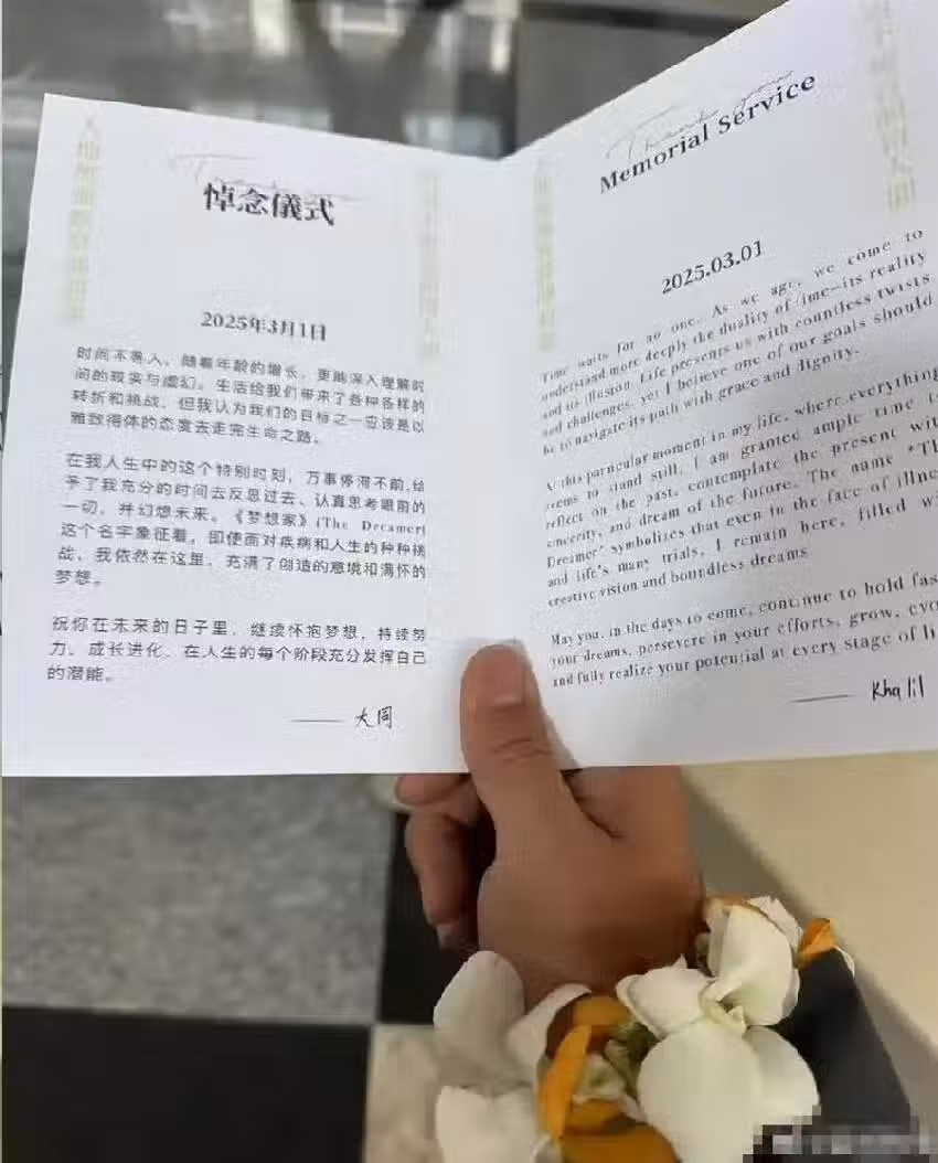 手卡全文如下: 「時間不等人,隨著年齡的增長,更能深入理解時間的現實與虛幻。 生活給我們帶來了各種各樣的轉折和挑戰,但我認為我們的目標之一應該是以雅致得體的態度去走完生命之路。 在我人生中的這個特別時刻,萬事停滯不前,給予了我充分的時間去反思過去、認真思考眼前的一切,並幻想未來。 《夢想家》(The Dreamer)這個名字象徵著,即使面對疾病和人生的種種挑戰,我依然在這裡,充滿了創造的意境和滿懷的夢想。 祝你在未來的日子裡,繼續懷抱夢想,持續努力,成長進化,在人生的每個階段充分發揮自己的潛能——方大同」