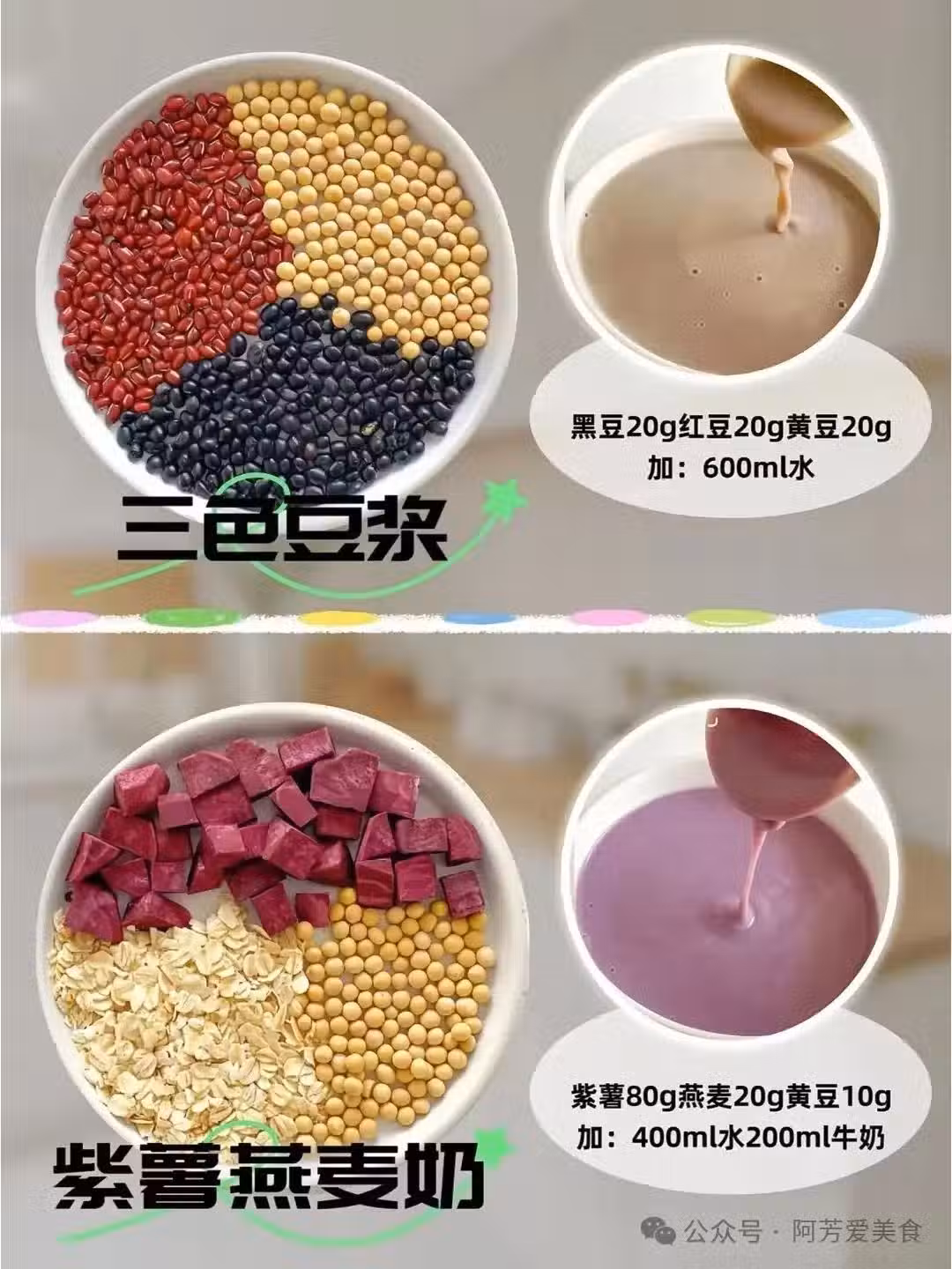 這幾種豆漿都很好做,早晨時間來不及,可以晚上睡前提前預約定好時間,早晨起來洗漱完就可以喝了,大家都都可以試一試哦,小貼士:給孩子上學當早餐也是不錯的選擇!