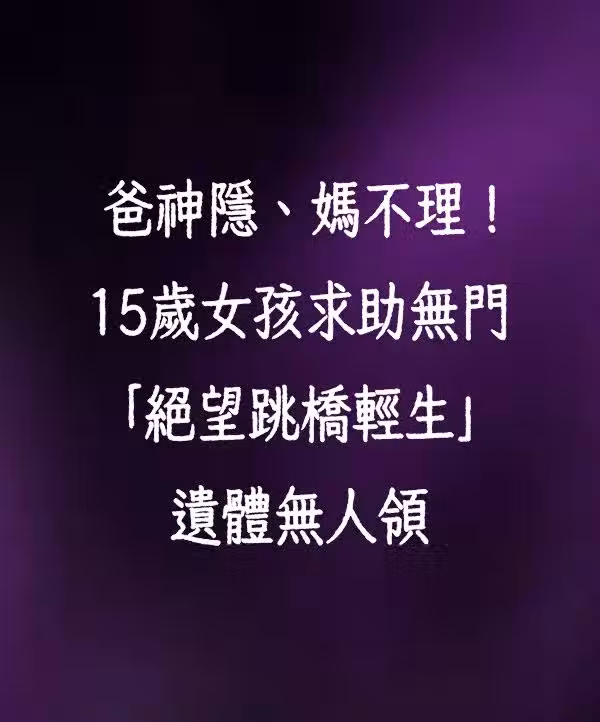 中國江蘇省鎮江驚傳一起悲劇,一名15歲少女身世坎坷,因父母離異,從小由爺爺撫養長大,近日爺爺跌傷,無法工作也沒錢就醫,少女只好向父母求救,未料父親直接封鎖她,母親則冷回一句「不關我的事,不要來煩我」,讓少女感到十分絕望,無助地站在丹陽大橋上,回頭望向人間最後一眼,隨後一躍而下,事後少女的遺體被打撈上岸,至今仍無人認領,令無數人心碎不已。