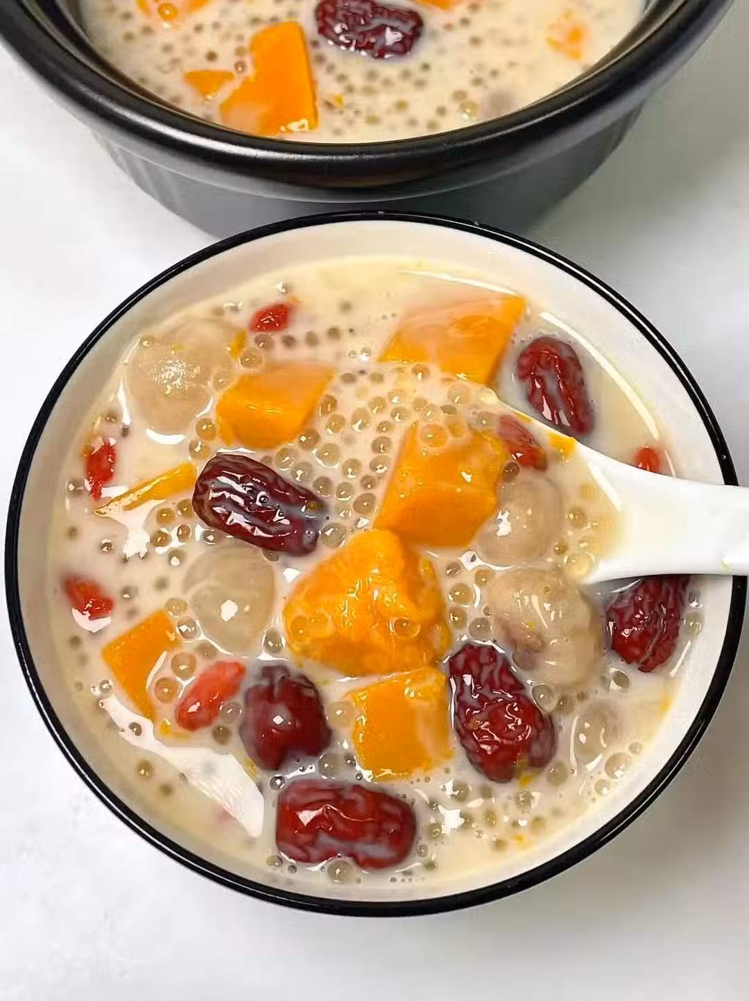 南瓜70g,西米30g,桂圓20g,紅糖20g,牛奶200g,紅棗4-8顆,枸杞適量
