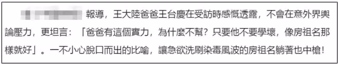 只是有句老話叫「慣子如殺子」,王大陸父親對孩子的溺愛,反而養出了一個叛逆兒子,他掏錢讓王大陸娛樂圈,給王大陸買上億豪宅,唯獨擔心王大陸違法犯罪,偏偏王大陸專門踩紅線,33歲成了殺人未遂案嫌疑人。