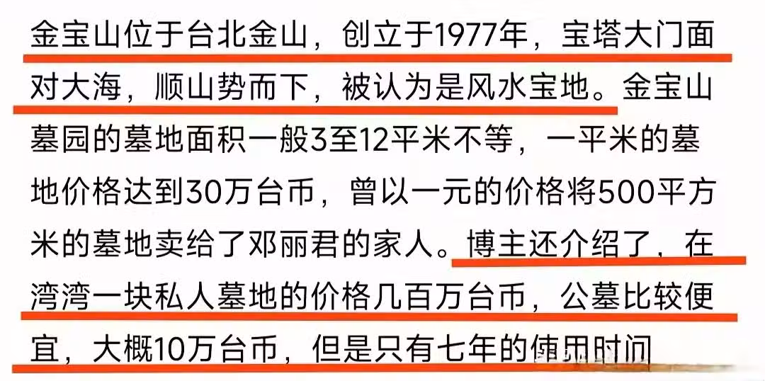 台灣知名博主稱在金寶山塔葬最多需要十萬新台幣,而買一塊專屬墓地,帶花園的那種需要幾百萬...............................