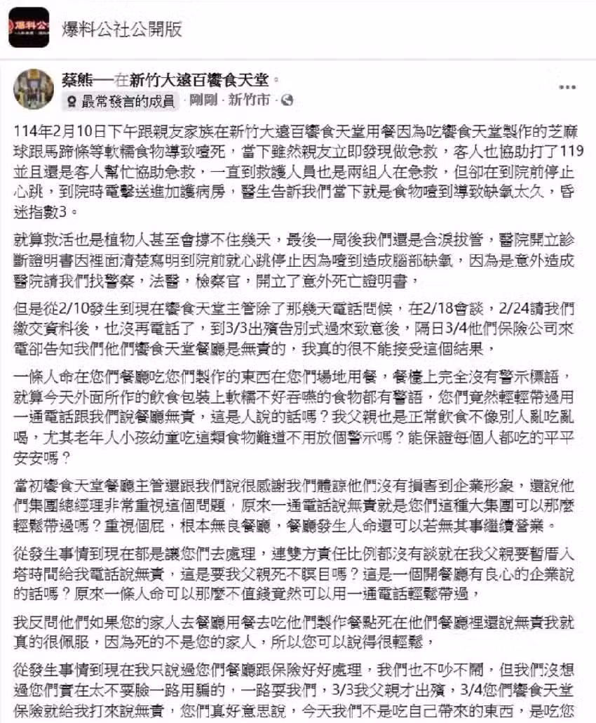 我最痛恨的是保險打來還說,看急救紀錄說有急救人員十分鐘內到餐廳,就算是有盡到急救責任!我聽到他們講這種話真的更覺得可惡,因為我的親友還有現場客人說當下非常混亂,還是客人當下幫忙急救打電話,完全沒有SOP流程,都是現場客人跟親友大喊有人噎到了,餐廳才有動作,餐廳本身完全沒有專業急救人員!