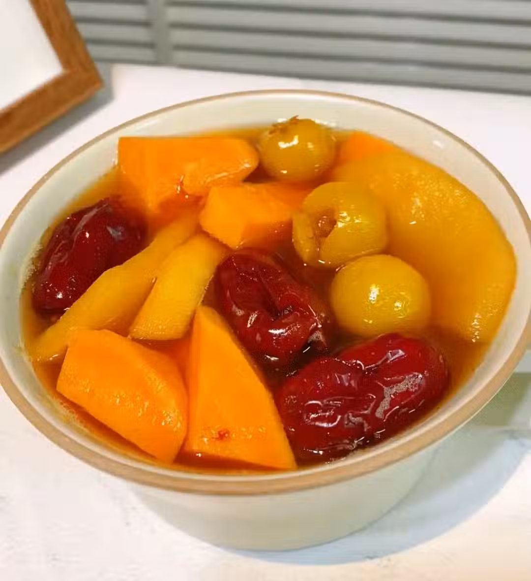 食材:蘋果1個、紅薯100g、山楂干4片、紅棗5顆、紅糖適量