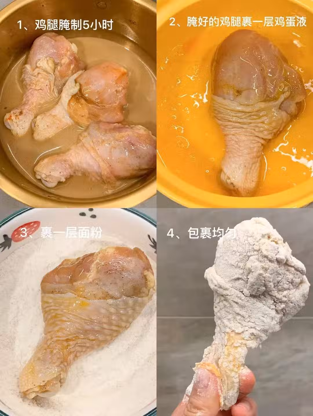 2、將腌好的雞腿、裹一層雞蛋液、一層麵粉3、鍋內燒油!筷子放進去冒泡就可以下鍋,中小火炸至兩面金黃!15分鐘左右就可以出鍋!