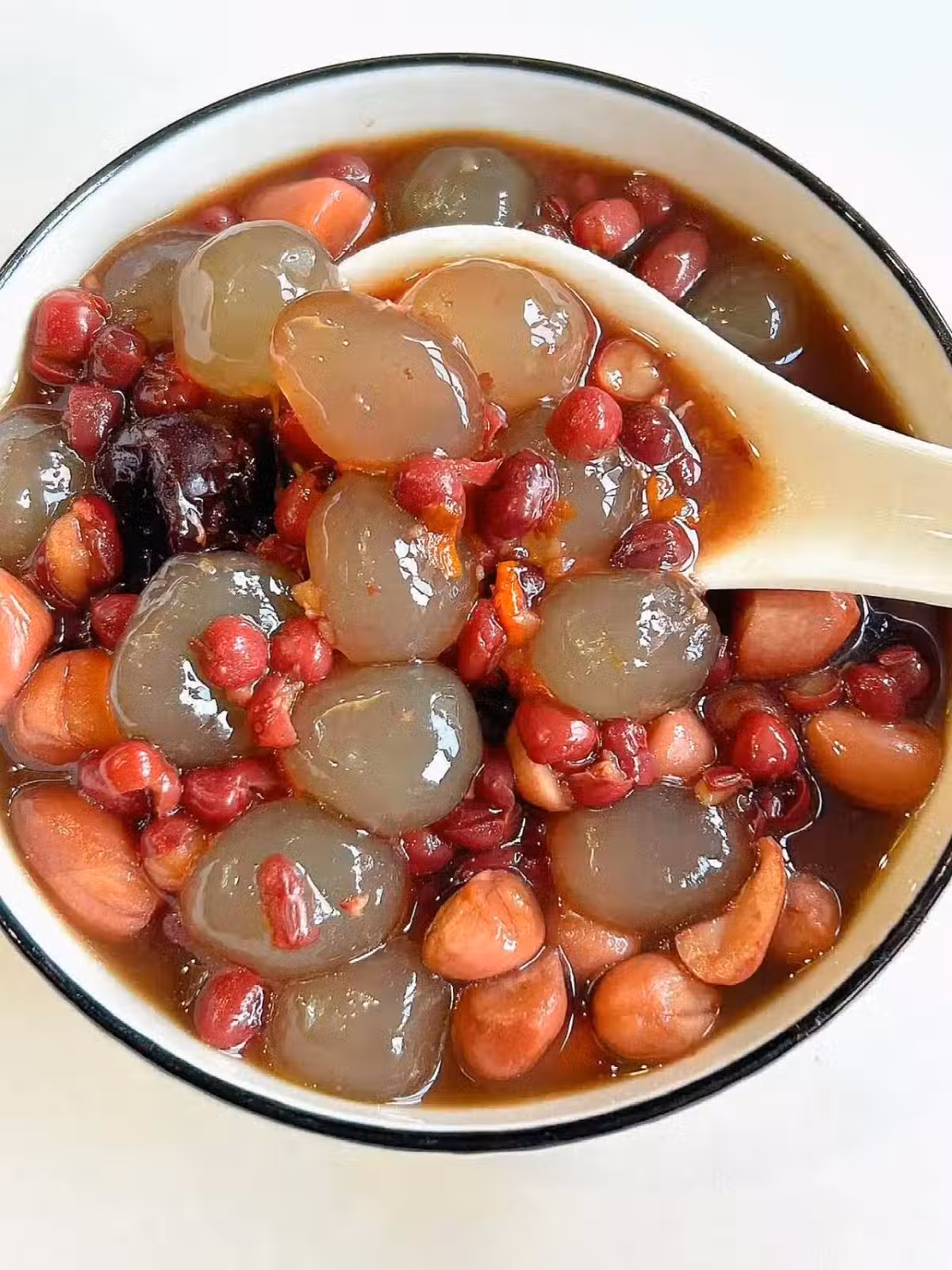 食材:花生100g,紅糖2塊,木薯粉1杯,枸杞適量,紅豆100g,紅棗5粒
