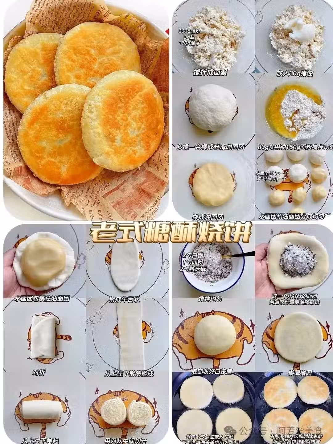老式糖酥燒餅,這款比較適合喜歡吃甜口味的寶子們。弄好麵粉後,記得要先水面包裹住油麵,再加入調好的餡料,包好在下鍋煎非常的香脆又好吃。