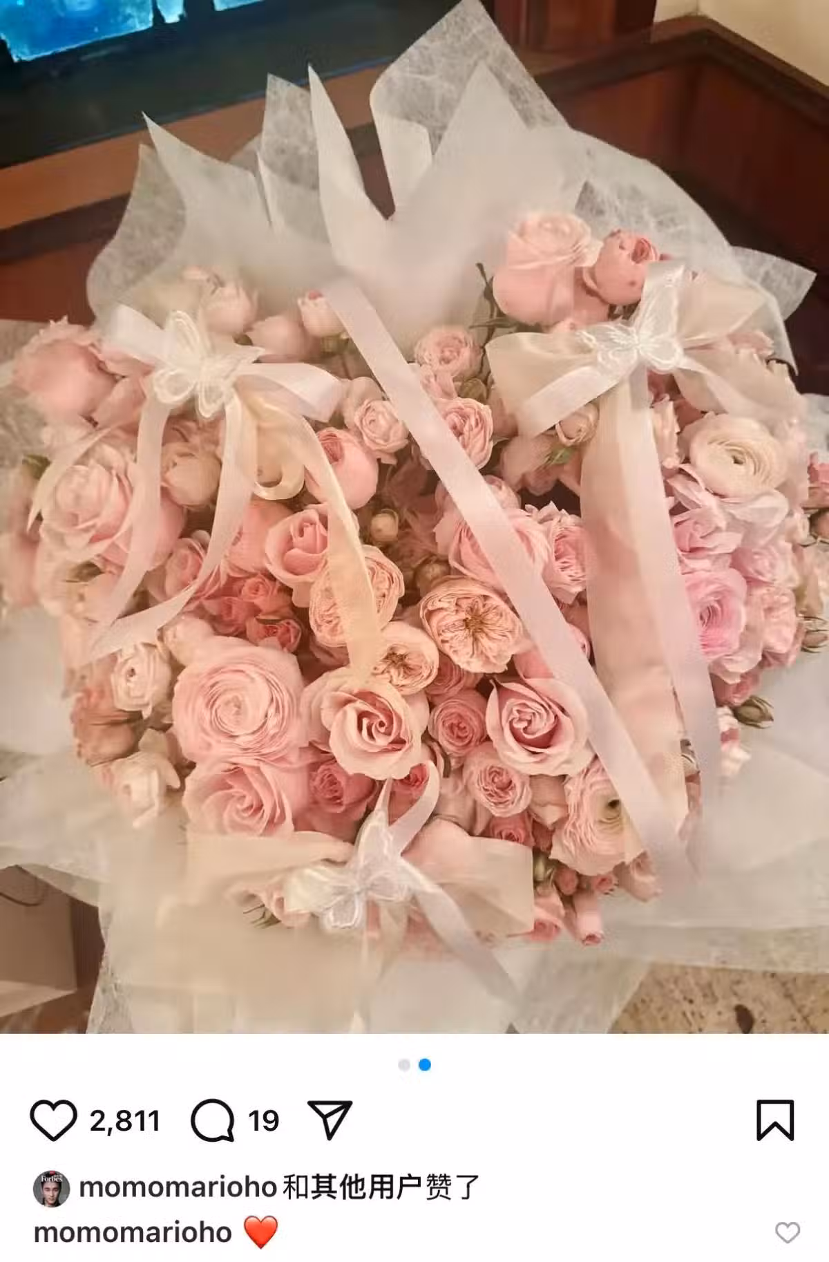 奚夢瑤應該是最喜歡那一大束的粉色玫瑰花吧,她給花拍了特寫,還抱著花拍了合影,並發文給老公送上愛心表情。話說抱著花的奚夢瑤可謂是人比花嬌呀,看起來真的好美。