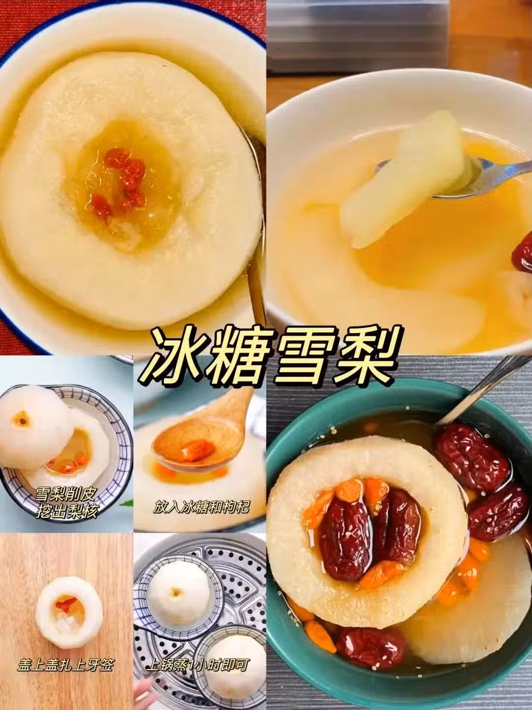 雪梨1個,冰糖15~30克,清水適量。可選配料:紅棗、枸杞適量。