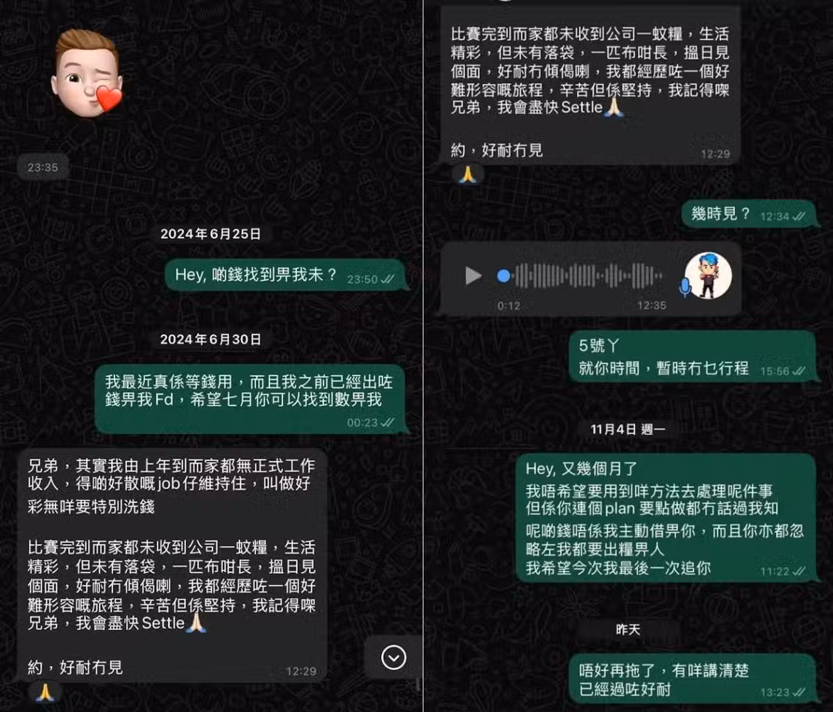 截圖見到追債人先後於去年6月25及30日,向顏米羔發出短訊問什麼時候還錢,疑似顏米羔回覆:「兄弟,其實我從去年到現在都沒工作收入,得那些很散的工作維持著,叫做幸好沒什麼要特別洗錢。比賽完到現在都沒收到公司一塊錢,生活精彩,但沒有進口袋,一匹布這麼長,擇日見面,好久沒有聊過啦,我都經歷了一個好難形容的旅程,辛苦但是堅持,我記得啦兄弟,我會儘快結算。」追債人之後反覆聯絡對方,及至前日再發短訊,但仍然沒有迴音,或因此原因決將事件放上網。