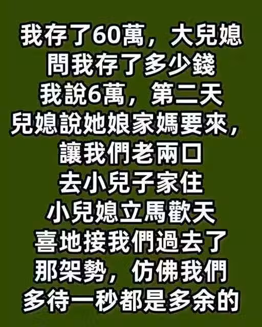 我存了60萬,大兒媳問我存了多少錢,我說6萬,第二天兒媳說她娘家媽要來,讓我們老兩口去小兒子家住,小兒媳立馬歡天喜地接我們過去了那架勢,仿佛我們多待一秒都是多餘的.......