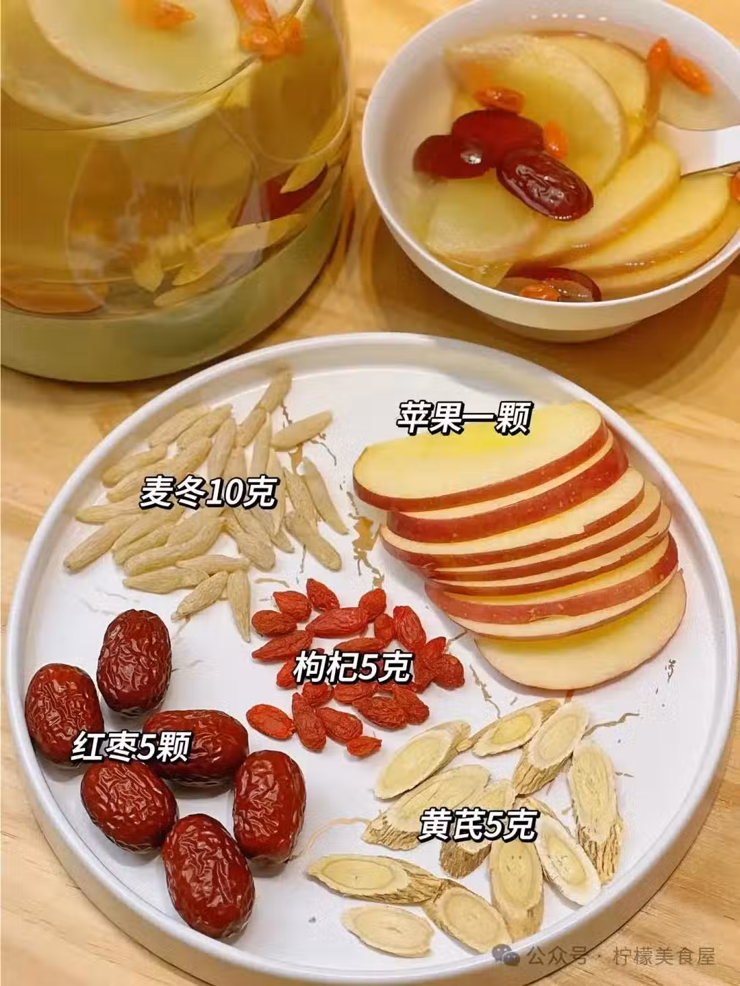 做法: 1、蘋果用鹽搓洗乾淨,去核切塊。黃芪、麥冬提前泡水清洗乾淨。紅棗去核。 2、除枸杞,所有食材放到養生壺裡,加適量水,煮20分鐘,再放枸杞燜5分鐘即可。