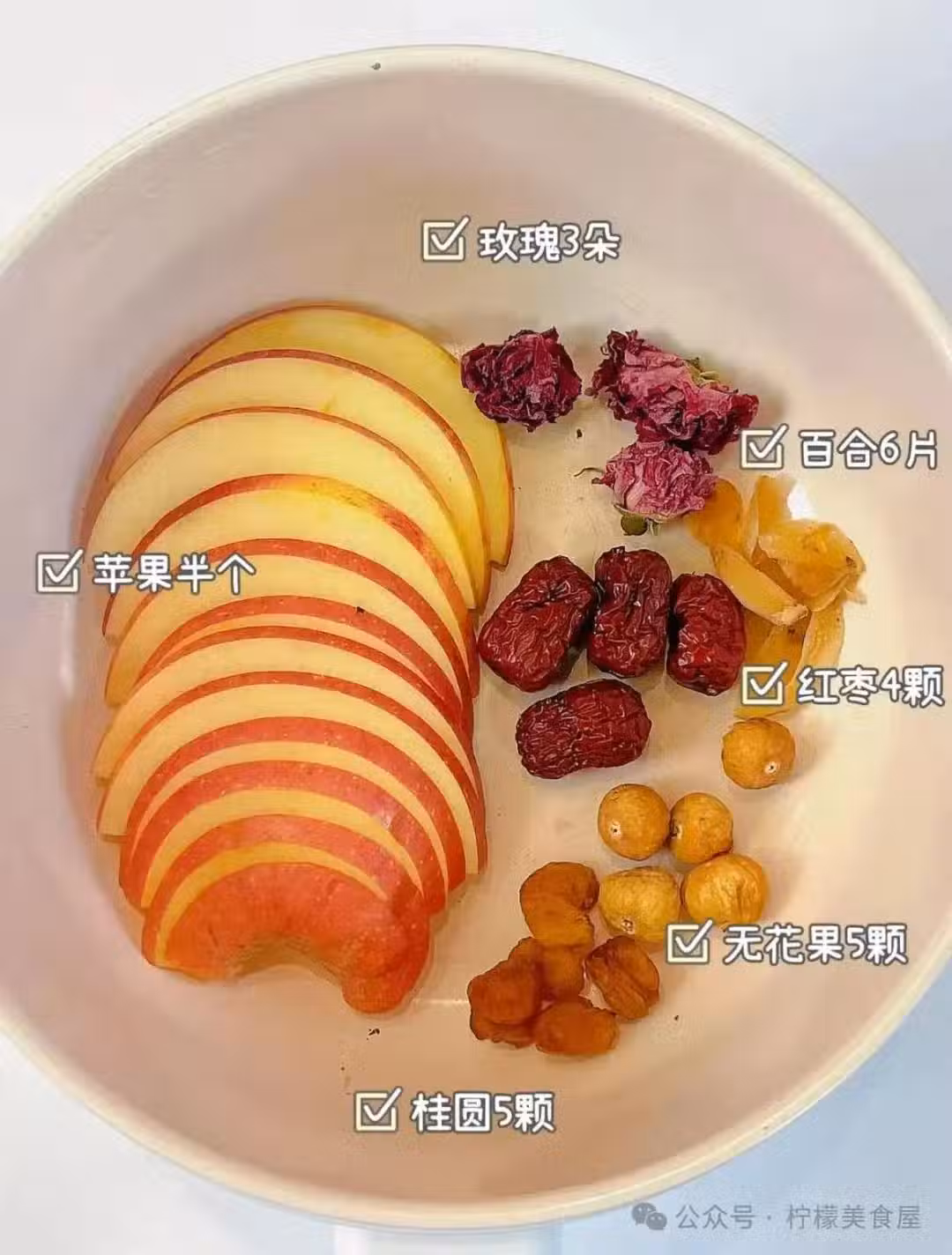 做法: 1、蘋果用鹽搓洗乾淨,去核切塊。百 合、無花果、桂圓、玫瑰、紅棗提前泡水清洗乾淨。 2、所有食材放到鍋里,加適量水,煮15分鐘即可。