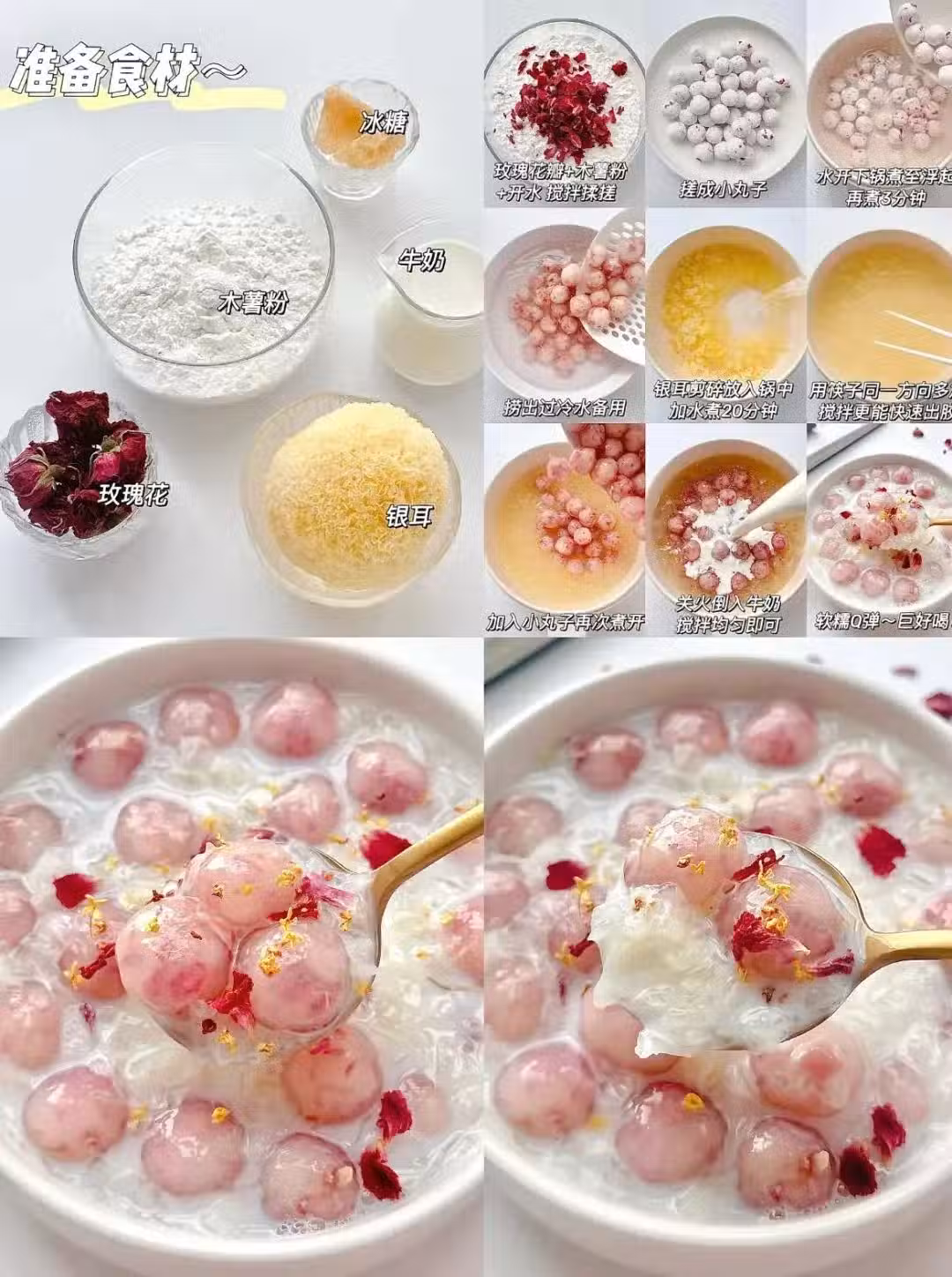 木薯粉、玫瑰花辧、銀耳、牛奶、冰糖