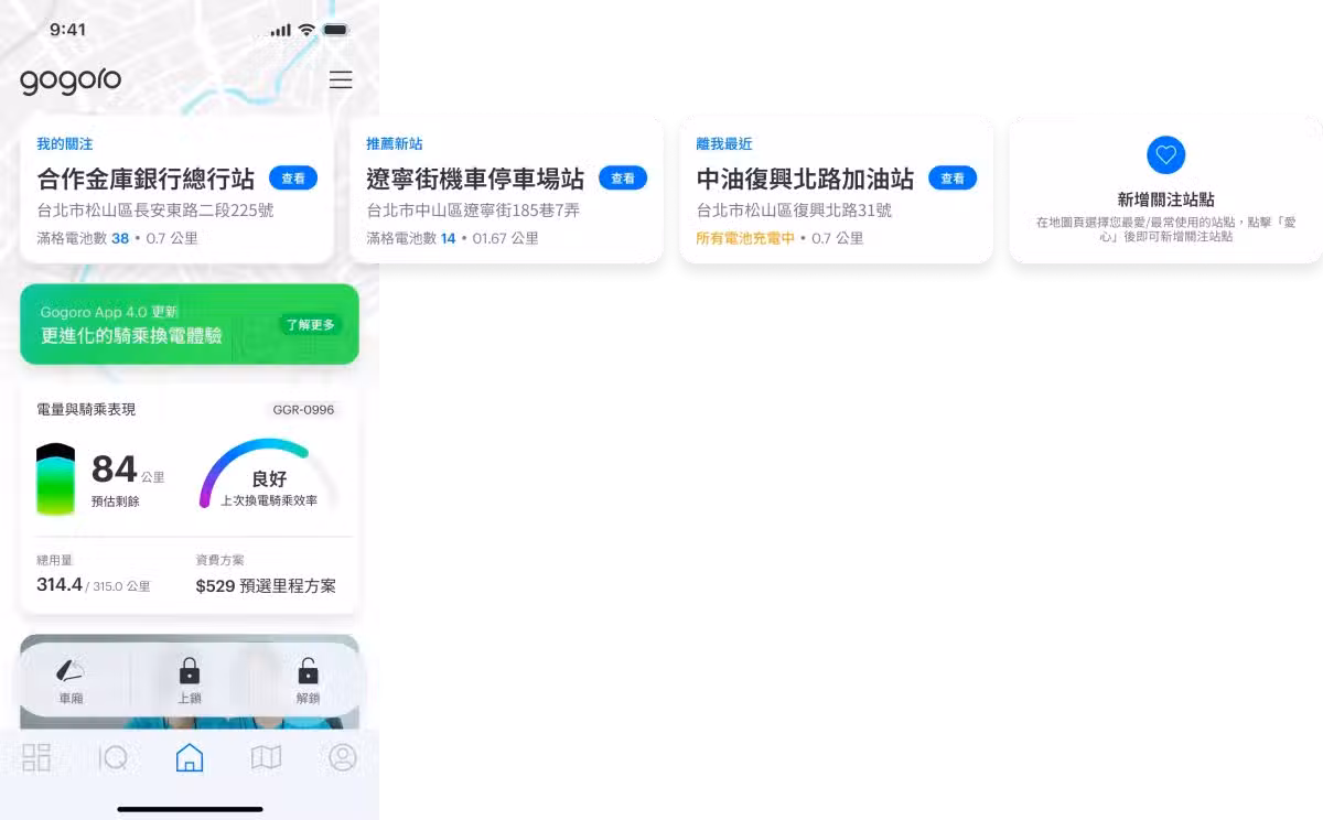 Gogoro App 4.0 全新改版,管理常用站點、監測騎乘效率、整合即時幫助中心,騎乘體驗更進化