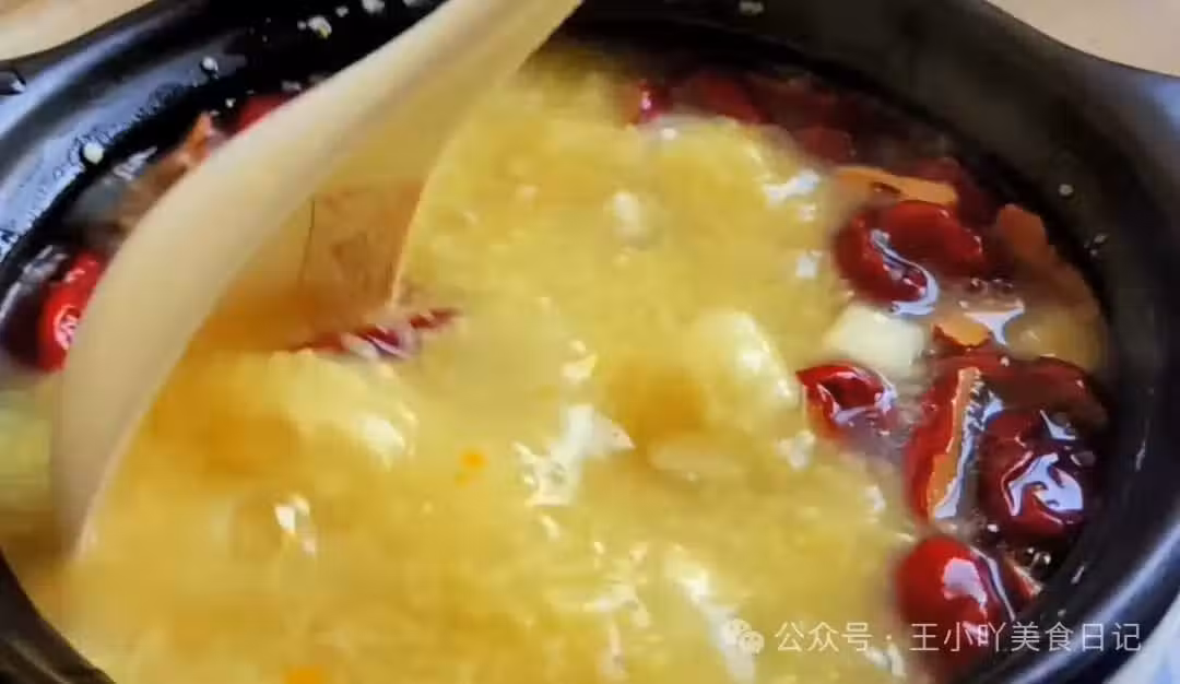 加入紅棗和橘皮:小火慢燉半個小時後,湯汁開始變得粘稠,茯苓的體積也明顯變大。此時,加入準備好的紅棗和橘皮碎末,稍微攪動一下,然後蓋上蓋子,繼續燉煮半個小時左右。如果沒有充足的時間,也可以將茯苓改刀切成小塊或者研磨成粉,以縮短燉煮時間。