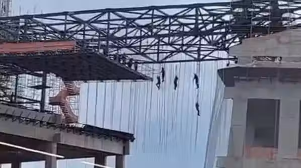 從網絡流傳影片中可看到,有8名工人懸吊在140米高空中,全都緊緊抓住繩索等待救援,畫面怵目驚心。