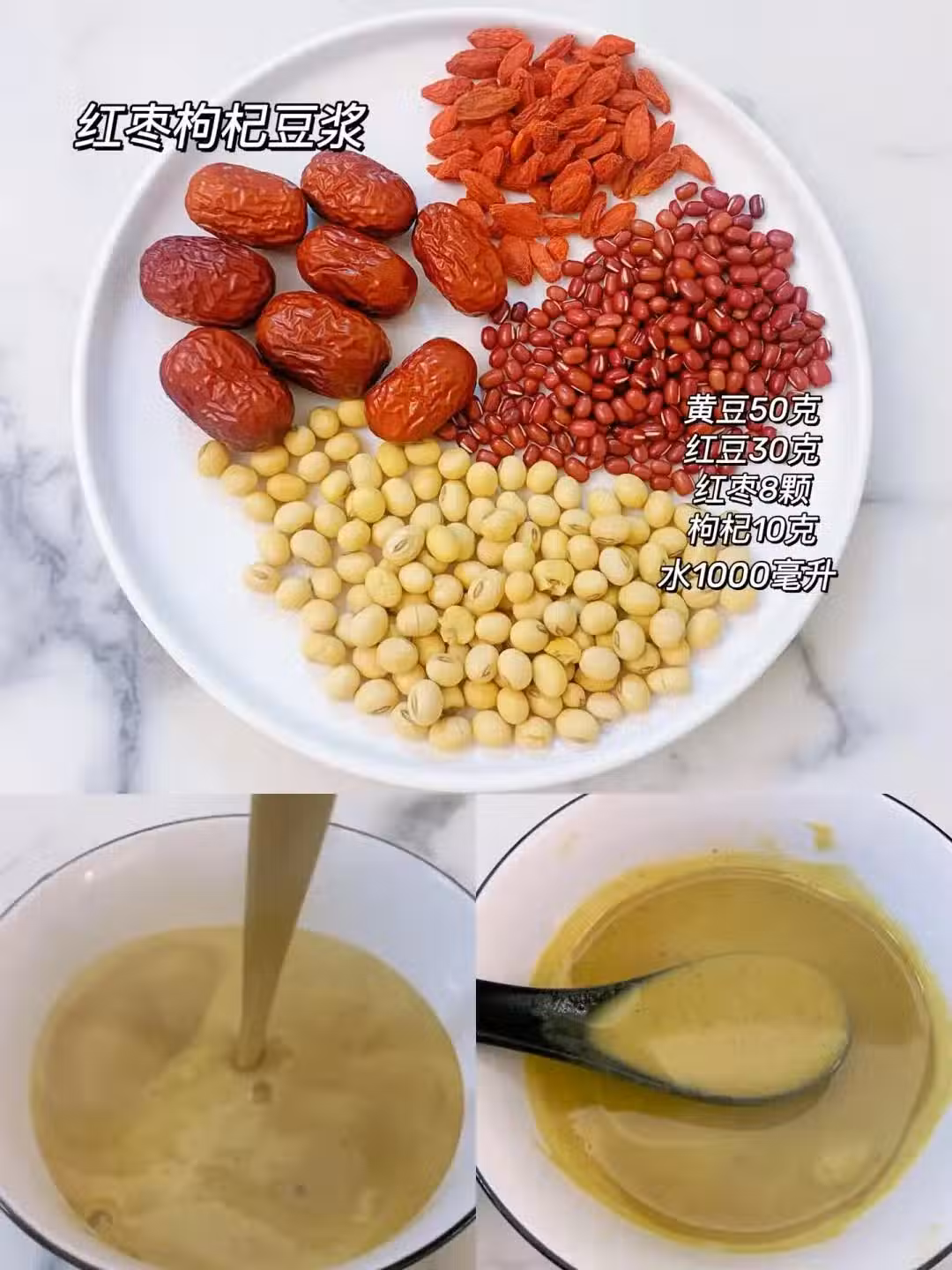 食材:黃豆50克 糯米20克 枸杞10克 紅棗10克 水800毫升