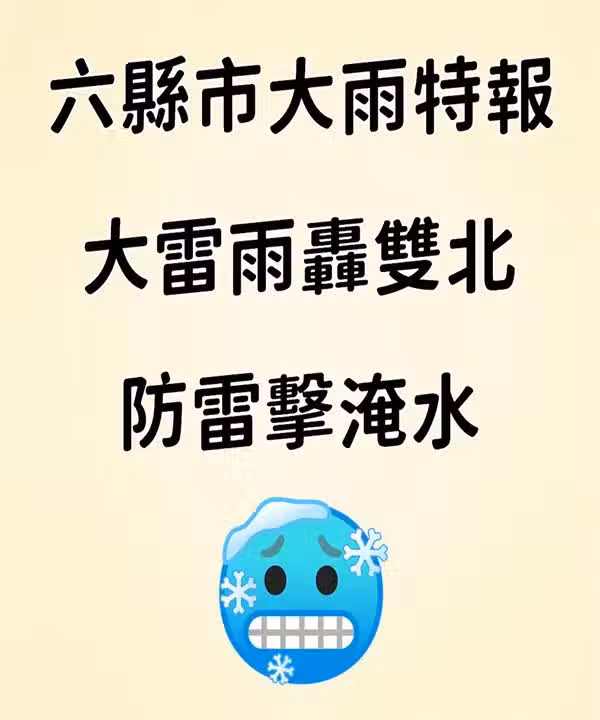 中央氣象署上午8時55分針對6縣市發布大雨特報,因鋒面影響,易有短延時強降雨,今(13)日新竹以北地區有局部大雨發生的機率,請注意雷擊及強陣風,低洼地區慎防積水。