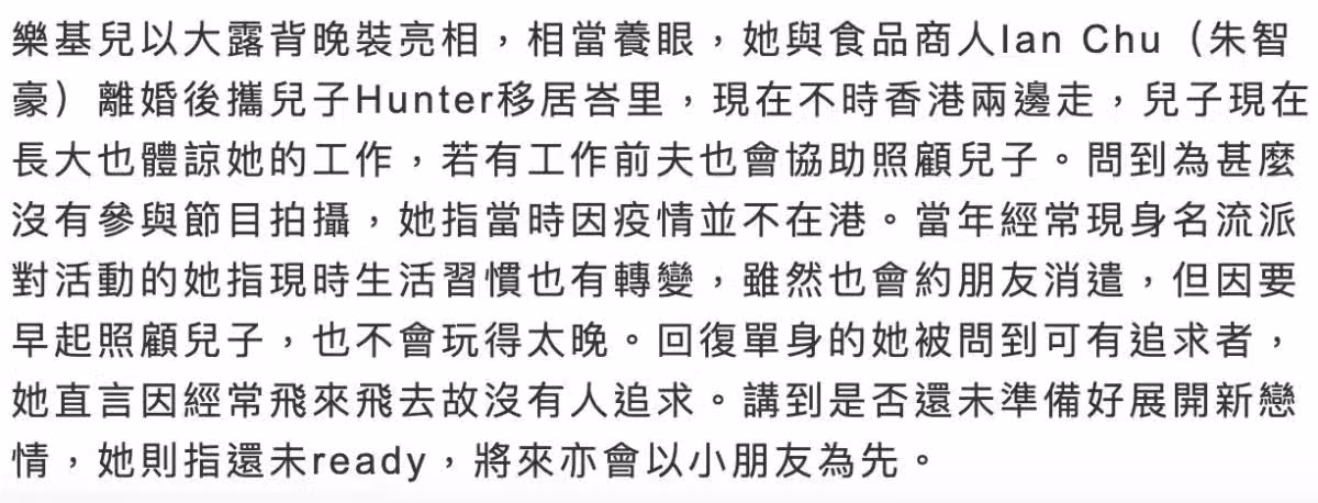 樂基兒稱有了兒子之後,生活習慣已經轉變,從前喜歡流連夜店以及名流派對,如今要照顧兒子,尤其是早起送孩子,所以也不會夜歸,總之就是一副好媽媽的姿態。對她來說,當下兒子就是她的一切,所以並不沒有打算展開新的戀情,凡事都會以兒子作為優先考慮。