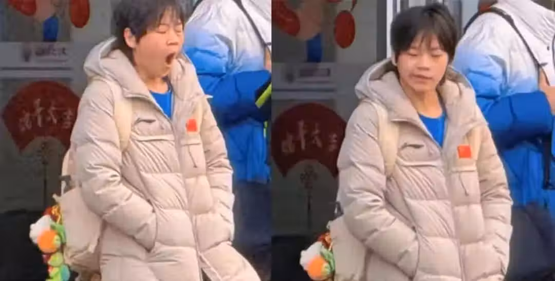 裡面估計只穿了一件T恤,外面套一件長款羽絨服,雙手插兜,一臉睡眼惺惺,張大嘴巴打哈欠,這表情包可豐富了,這就像我們普通人,覺是睡不夠的,但還是得爬起來當牛馬,全妹也不例外,得爬起來早訓。
