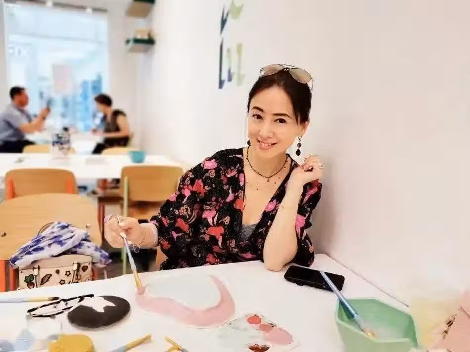 照片中的翁虹,以一身獨特而迷人的穿搭吸引著目光。她身著一襲黑色與粉色交織的花卉圖案連衣裙,色彩溫婉又不失活力。長耳環輕輕搖曳,增添了幾分優雅與風情。右手輕握粉色化妝刷,左手隨意搭在桌上,化妝品與畫筆散落其間,透露出她的藝術氣息與生活情趣。整體穿搭既展現了她的個人魅力,又與咖啡館的閒適氛圍相得益彰。