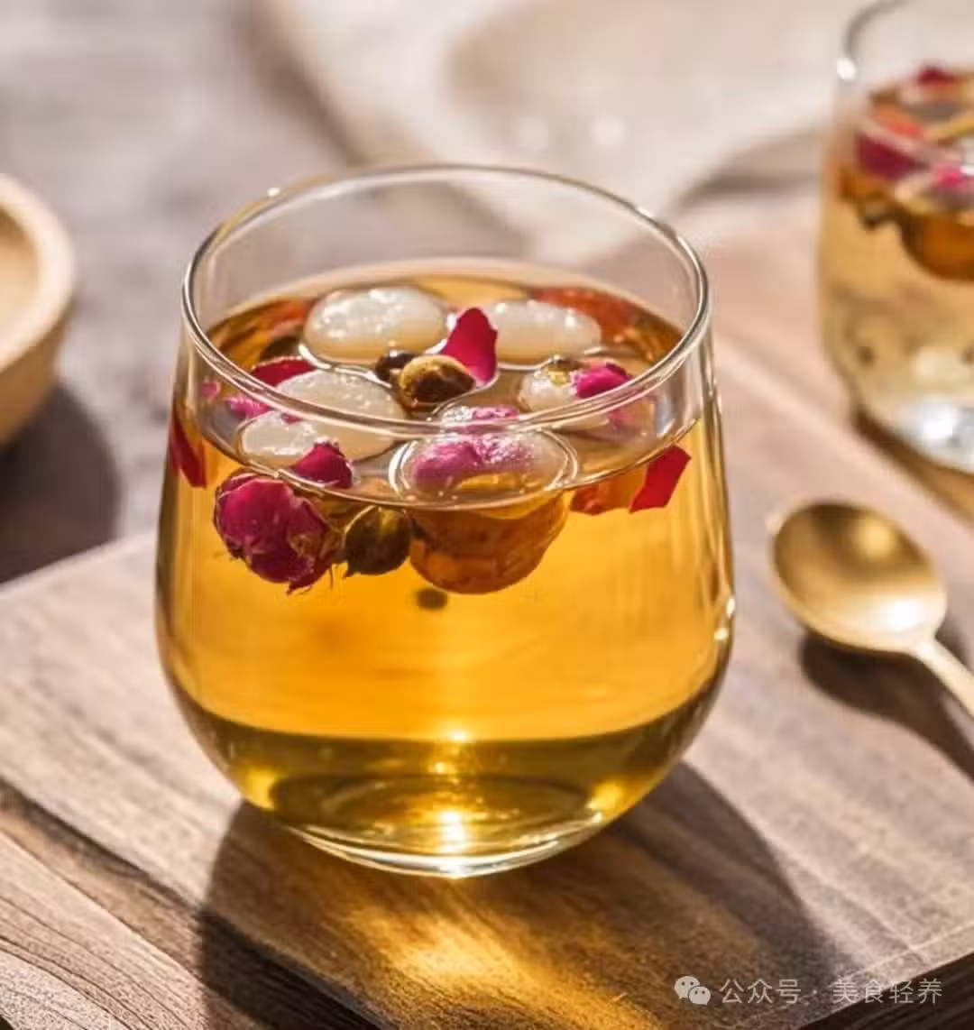 - 做法:桂圓乾和枸杞煮10分鐘,最後放入玫瑰花泡5分鐘即可飲用。