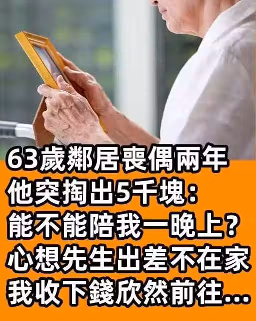 63歲鄰居喪偶兩年,他突掏出5千塊:「能不能陪我一晚上...」心想先生出差不在家,我收下錢欣然前往!