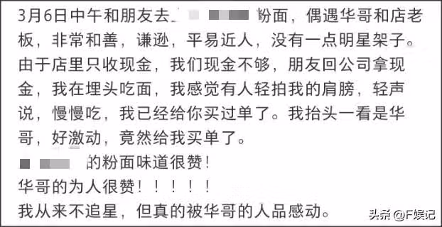 任達華最近的行蹤就被網友曝光了,而且還曝光了他私下的人品。有男路人和任達華在同一家麵店吃面。這位路人和朋友由於現金不夠,店內又只收現金,所以其中一個朋友回公司拿現金。隨後就發生了暖心一幕,路人正在低頭吃面,突然感覺到有人輕拍他的肩膀,然後聽見:「慢慢吃,我已經給你結過帳了。」
