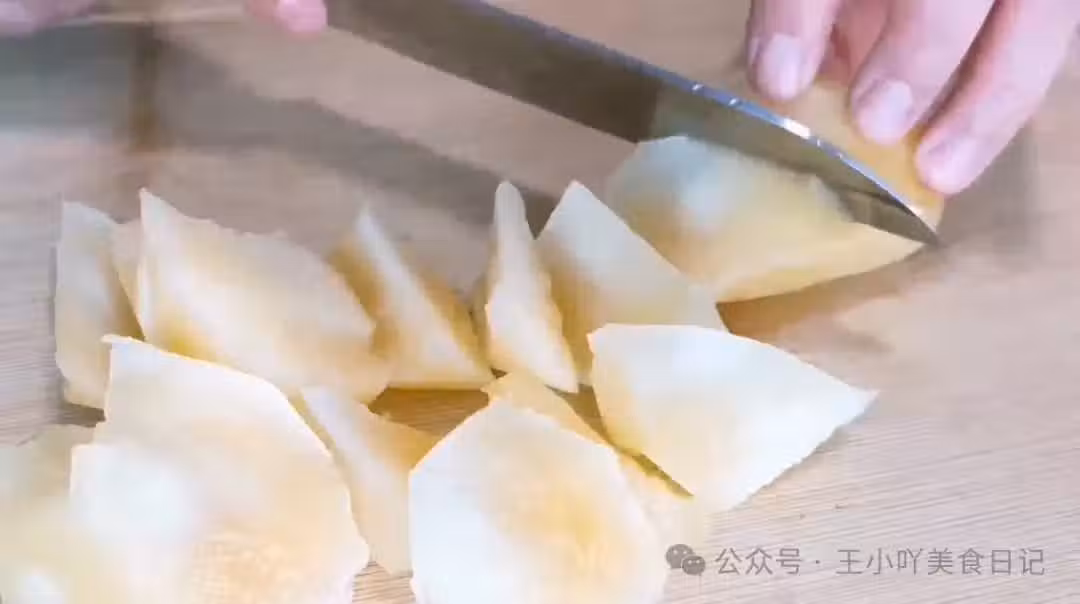 切割雪蓮果:將雪蓮果切成大小均勻的滾刀塊,每一刀切入約1/3處,再用刀尖輕輕一掰,雪蓮果塊便自然脫落,展現出其脆嫩的質地。這樣的切割方式,不僅美觀,還能更好地釋放雪蓮果的甜味與營養。