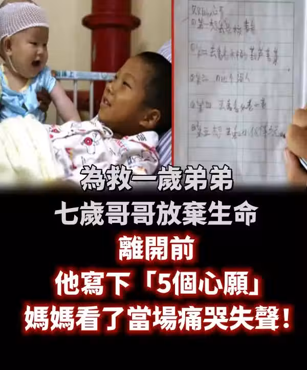 為救一歲弟弟 七歲哥哥放棄生命 離開前他寫下「5個心愿」媽媽看了當場痛哭失聲
