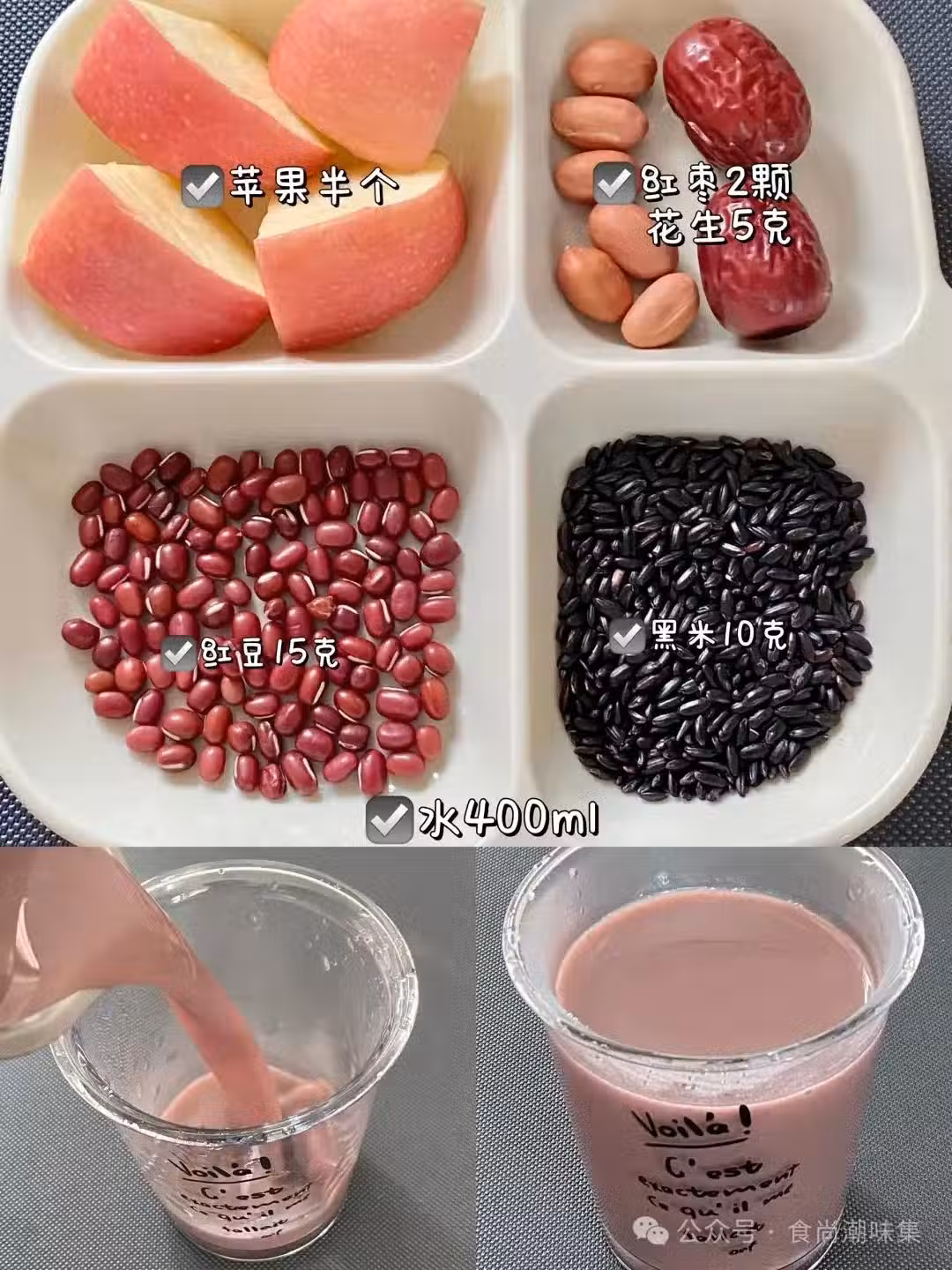 先來說說蘋果紅豆豆漿。這可是我超愛的一款,紅豆15g、黑米10g、花生5g、半個蘋果再加上2顆紅棗。紅豆祛濕補血,黑米養腎,花生營養豐富,再搭配上蘋果的清甜和紅棗的滋補,味道層次豐富,一口下去滿滿都是幸福感,喝完整個人都元氣滿滿!