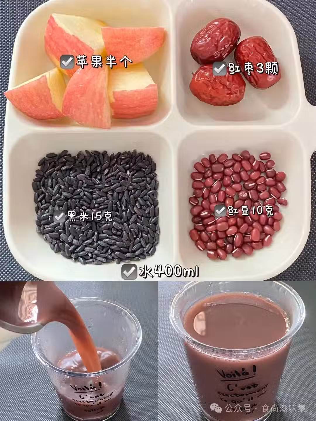 蘋果黑米豆漿也很不錯。10g紅豆、15g黑米、小塊蘋果還有3顆紅棗。紅豆和紅棗負責補血養顏,黑米補腎烏髮,蘋果則為這杯豆漿增添了清爽的口感,長期喝,頭髮烏黑亮麗,皮膚也會越來越好!