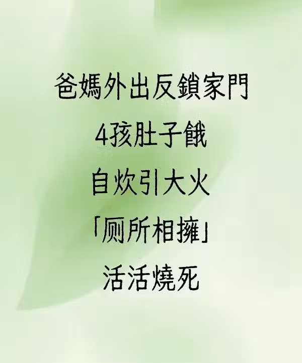 馬來西亞一對夫妻臨時要外出,獨留4名3到8歲的孩子在家中,並將家門反鎖,誰知4個小孩疑似肚子餓動手自己煮飯,不慎引發大火,無法逃出的他們只好躲到廁所,緊緊相擁被惡火吞噬。