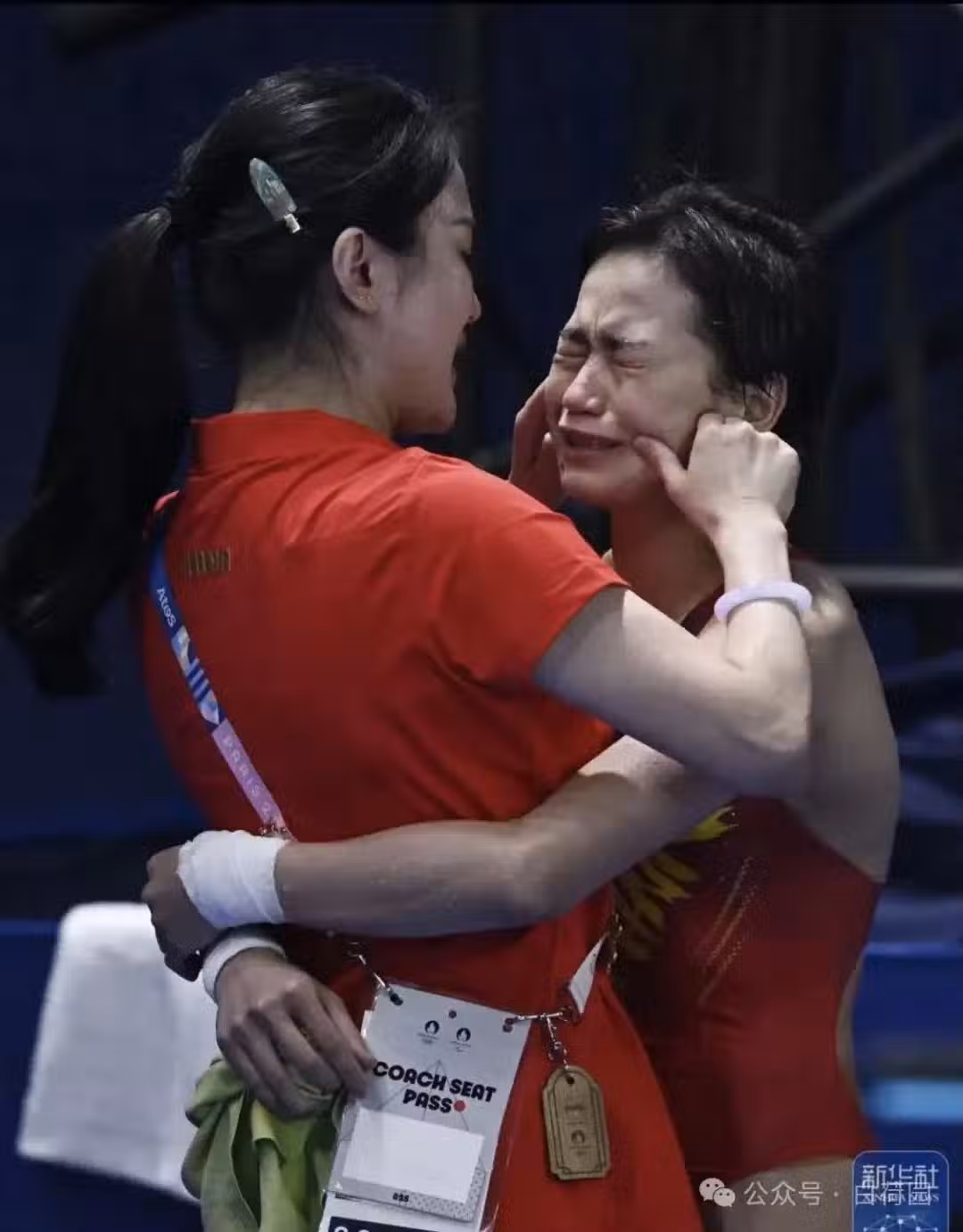 這張照片拍攝於巴黎奧運會賽場,當比賽結果揭曉,宣布全紅嬋獲得冠軍時,她撲向陳若琳的懷抱,陳若琳緊緊擁抱著她。全紅嬋淚流滿面失聲痛哭。陳若琳則滿臉的愛意,疼她爰她懂她。更為她自豪。亦師亦母的情愫盡在臉上。是啊,無論多麼的艱難曲折和坎坷,陳若琳陪全紅嬋走過。她是全紅嬋的貼身護衛保護神。